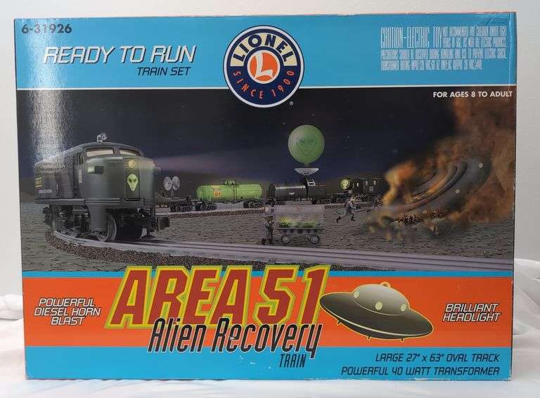 Lionel O Gauge 31926 Area 51 Alien Recovery Train set in original boxes. Trains look C8 with run time. Individual train boxes show little wear, bright, clean, square and solid. Set box has some clear tape repaired/reinforced corners, inside and out. Box shows light wear, bright, clean, square and solid. Set box is missing dividers or what ever held the individual boxes in place. No track or transformer, original instructions sheet is present and included.