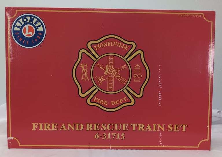Lionel O Gauge 31715 Fire and Rescue train set in original box with instructions booklet, C8 light run time. Individual boxes show no wear, set box shows light surface wear, bright, clean, square and solid.