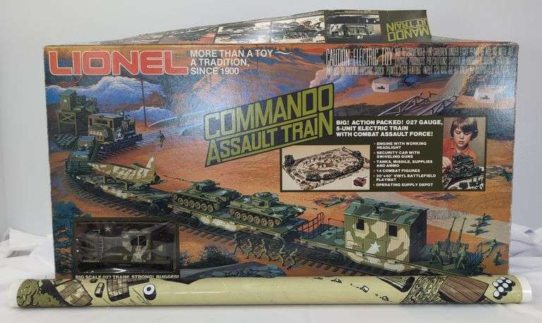 Lionel O Gauge 6-1355 Commando Assault Train set in original box with paraphernalia and floor mat. Set has been assembled and ran, C8. Mat shows little wear. Inner cardboard divider is excellent with little wear, cardboard insert cover is present and in excellent condition. Bottom of box is excellent with little wear. Lid has a torn side panel. Box is still bright, clean, square and solid.