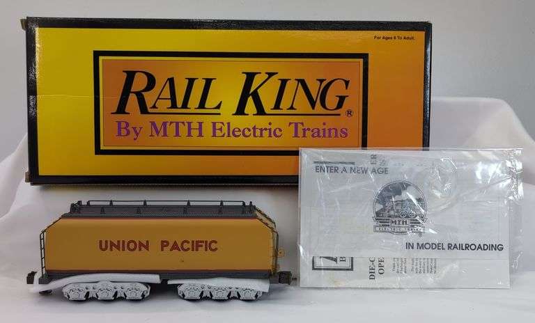 MTH Rail King O Gauge 30-1130 Union Pacific auxiliary tender in original box with light run time and bent brake wheel with light scratch behind it, C7+. Box is bright, clean, square and solid with price sticker.