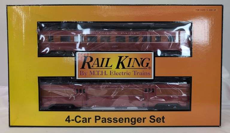 MTH Rail King O Gauge 30-1526P Southern Pacific 4-car 60' streamlined passenger set in original box, trains look C8-9 barely run. Box shows little wear, bright, clean, square and solid. Set includes original literature.