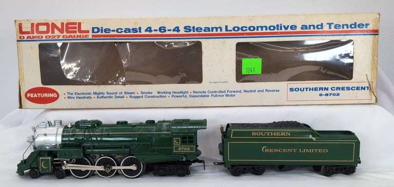 Lionel O Gauge 6-8702 Southern Crescent die-cast 4-6-4 steam locomotive and tender in original box. Tender is missing a rear step. Train otherwise looks C7. Styrofoam is in very good condition. Box has torn cellophane display window, torn and tape repaired flaps, inventory sticker, etc. Box is fairly bright, clean, square and solid.