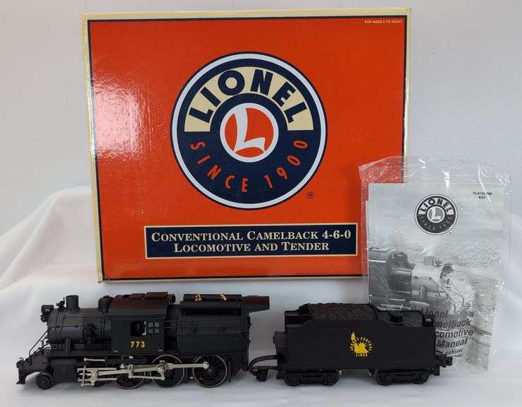 Lionel O Gauge 28749 Jersey Central Lines Conventional Camelback cab number 773 in original box, beautiful C8 with light run time. Box shows little wear, auction sticker, minor corner dings, bright, clean, square and solid.