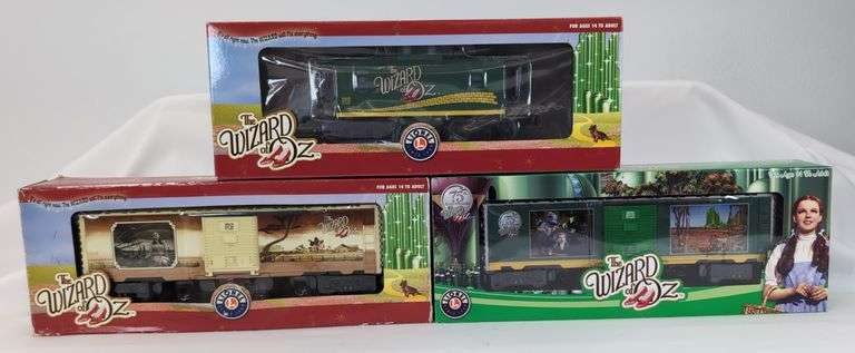 Lionel O Gauge Wizard of Oz freight cars; 29791 75th anniversary boxcar, 39318 boxcar #2, 36648 caboose in original boxes, C8 run time. 39318 box shows mild wear to flap fold, some edges and some corners. Boxes are otherwise bright, clean, square and solid.