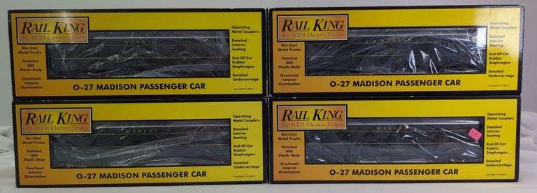 MTH Rail King O Gauge Wabash Madison passenger cars 30-6262B baggage, 30-6262C coach, 30-6262D coach and 30-6262E observation, in original boxes. Trains look great C8 with run time. Boxes have torn end flap on one end, little wear, one has an inventory sticker, bright, clean, square and solid.