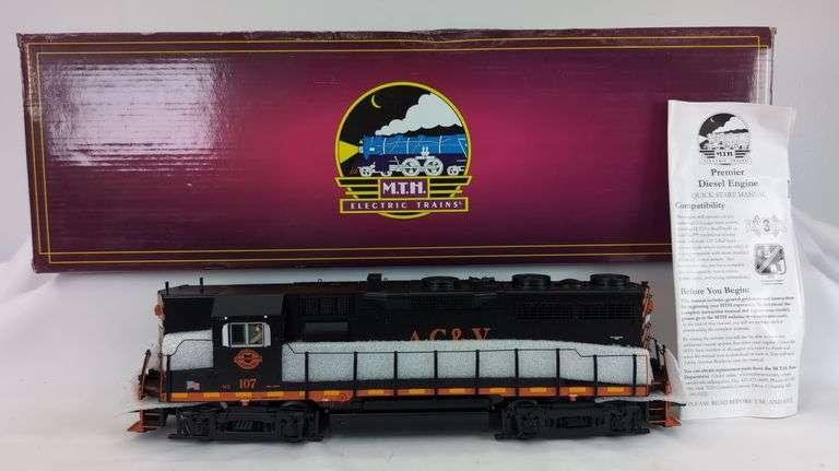 MTH O Gauge 20-20287-1 Akron, Canton & Youngstown cab number 107 GP-35 diesel locomotive with ProtoSound 3.0 (Hi-Rail wheels) with instructions and excellent styrofoam. Train is missing one horn? roof trim piece. One window awning is glue repaired and other is detached but present and included inside box. Never attached snow plow trim in factory sealed bag included. Train looks very nice C7 with some run time on wheels and rollers. Box has some minor corner and edge wear and a ding to a side corner. Box is bright, clean, square and solid.