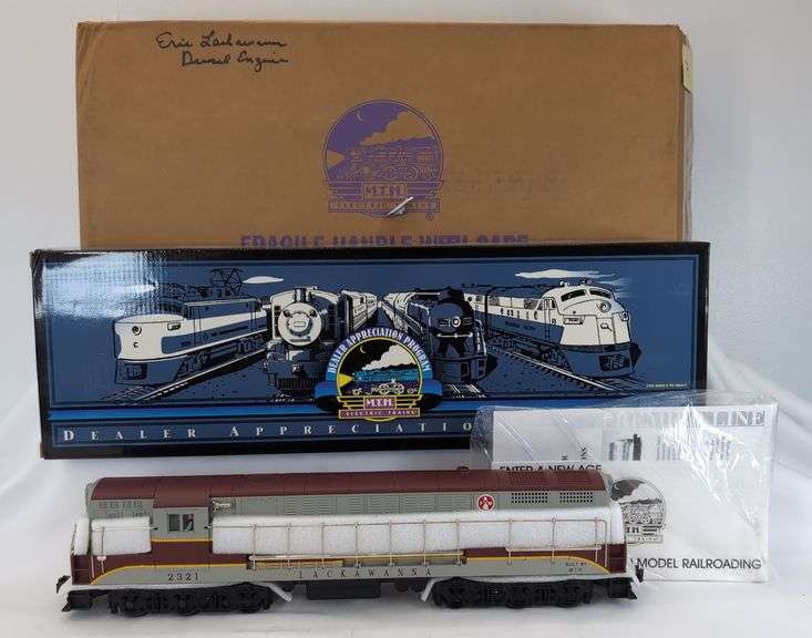 MTH O Gauge 20-80001d Lackawanna FM Trainmaster diesel locomotive with Proto-Sound in original box with instructions and literature, train looks perfect C8 with run time. Box shows little wear, bright, clean, square and solid. Train will arrive in an ill-fitting factory shipper without label.
