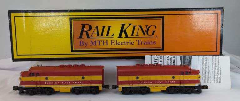 MTH Rail King O Gauge RK-2007LP Florida East Coast F-3 AA diesel locomotive units with Proto-Sound in original box with instructions and literature, perfect C8 with light run time. Box shows minor wear to some corners and edges. Box is otherwise bright, clean, square and solid.