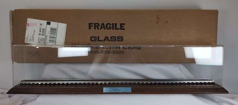 Lionel O Gauge display board, track, acrylic cover, adhesive backed nameplate in shipper for a Scale J-1e Hudson, possibly catalog number 18005. Display is opened, but appears to have never been displayed. Perfectly clean with no wear, C9-10. Plate is in factory sealed package, never attached. Shipper shows light surface wear, square and solid.