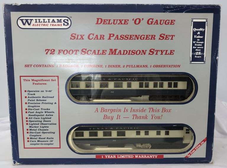 Williams O Gauge SM234 WAL #77234 Texas & Pacific 72' scale Madison style passenger cars in box, trains are fantastic C7-8+ with very light run time. 2540 baggage, 2541 REA combine, 2542 diner, 2543 Pullman, 25453 Pullman, and 2544 observation. Individual boxes show little wear, some corner dings. Set box shows moderate wear and tears around flaps and openings, box is bright, clean, square and solid.
