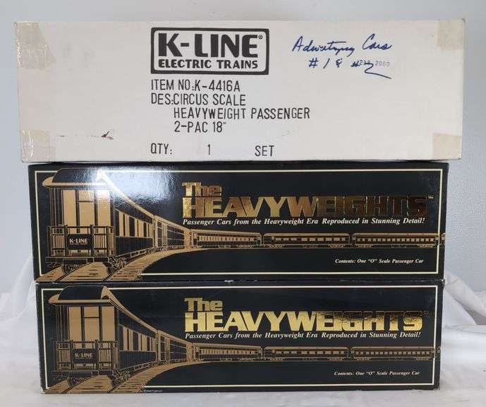 K-Line O Gauge K4416A Circus heavyweight Circus advertising passenger set in original boxes with shipper. Trains look fantastic C8, run time. K4416-0001 Circus Transport Railroad Advertising Excursion car #1 and K4416-0002 Circus Transport Railroad Advertising car #2. Boxes show some wear and tear to flaps, bright, clean, square and solid. Shipper shows little wear, square and solid.