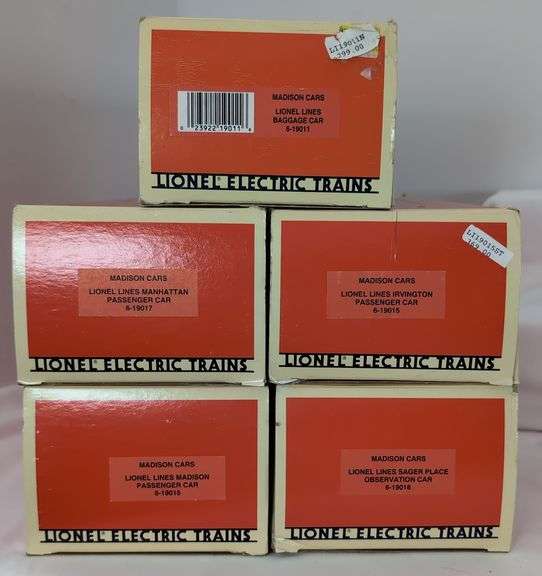 Lionel O Gauge Madison passenger cars 19011 baggage, 19015 Irvington coach, 19016 Madison coach, 19017 Manhattan coach, 19018 Sager Place observation; in original boxes with literature. Trains look beautiful C8 run time. 19015 box is missing an end flap on one end, some boxes have price stickers, otherwise boxes show little wear, bright, clean, square and solid.