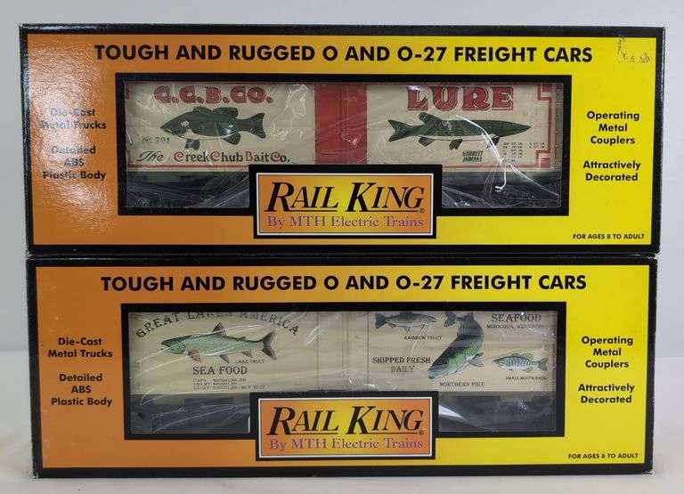 MTH Rail King O Gauge 30-7858 Creek Chub Bait Co. modern reefer and 30-78047 Great Lakes Seafood modern reefer, in original boxes. Trains look C8 with run time. Boxes show little wear, bright, clean, square and solid.