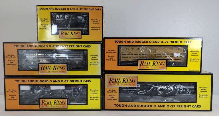 MTH Rail King Richmond, Fredericksburg & Potomac RF&P 30-75317 ore car w/ore load, 30-73311 3-dome tank, 30-75631 4-bay cylindrical hopper, 30-76115 flat car w/two 1928 USPS delivery trucks, 30-7130 19th century Confederate Army stock car, in original boxes. Trains look C8. Some boxes have a price sticker. Boxes show little wear, bright, clean, square and solid.