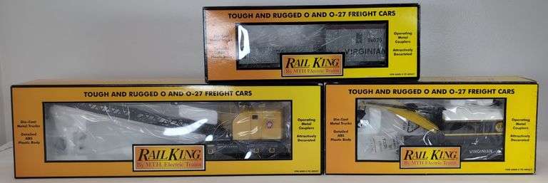 MTH Rail King O Gauge 30-7018E VN 90076 Virginian Crane Tender, 30-7018D VN X-243 Virginian Crane, 30-7932 PRR 85384 Pennsylvania Crane in original boxes, trains look fantastic C8 run time. 30-7018D box has a tape repaired/reinforced end flap. Boxes otherwise show little wear, bright, clean, square and solid.