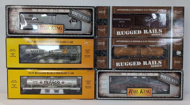 MTH Rail King O Gauge freight rolling stock; 30-4136a Pennsylvania tank, 30-8201 Union Pacific die-cast gondola with junk load, 33-7301 Denver & Rio Grande tank, 33-7309 Texaco tank, 30-8601 Erie Lackawanna die-cast reefer and 30-7403 Pennsylvania single door boxcar, in original boxes. Trains look great C7-8. Boxes show some minor surface wear to some corners/edges. Boxes are otherwise bright, clean, square and solid.