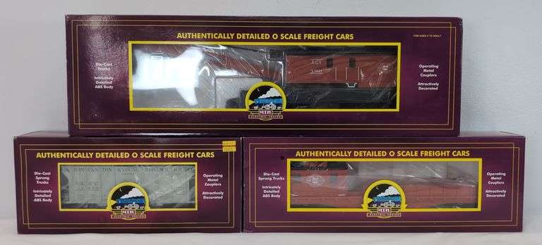 MTH O Gauge Akron, Canton & Youngstown freight rolling stock; 20-97287 ACY #31564 PS-2 hopper, 20-95356 ACY #988 crane tender, 20-95352 ACY #991 crane in original boxes. Hopper looks C8 from run time. Tender and Crane look un-run C9-10. Boxes show little wear, bright, clean, square and solid.