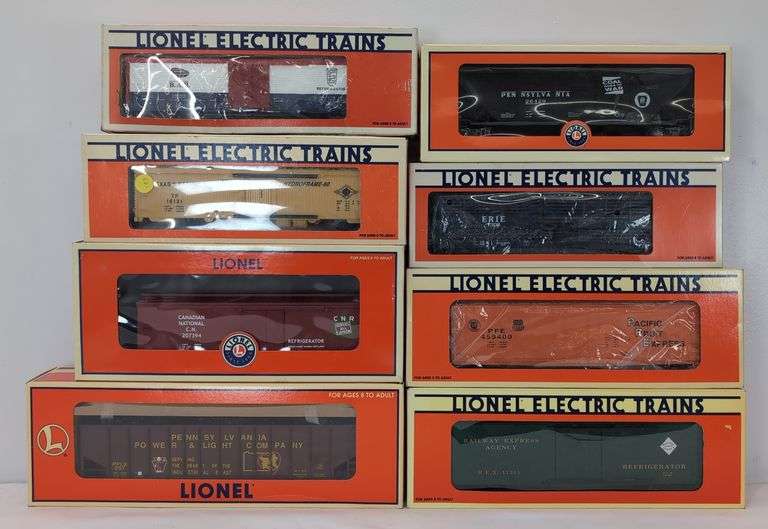 Lionel O Gauge 16131 Texas and Pacific reefer, 26429 Pennsylvania 4-bay hopper, 17311 Railway Express Agency reefer, 16813 1997 LOTS Power & Light Co. 3-bay hopper, 19503 Bangor & Aroostook woodside reefer, 7303 Erie-Lackawanna stock car, 17305 Pacific Fruit Express reefer, 26178 Canadian National refrigerator car, in original boxes C7-8. Some boxes show some light wear and tears, price stickers, etc. 26178 box is missing inner packing, box car is simply wrapped in bubble wrap. Boxes are bright, clean, square and solid.