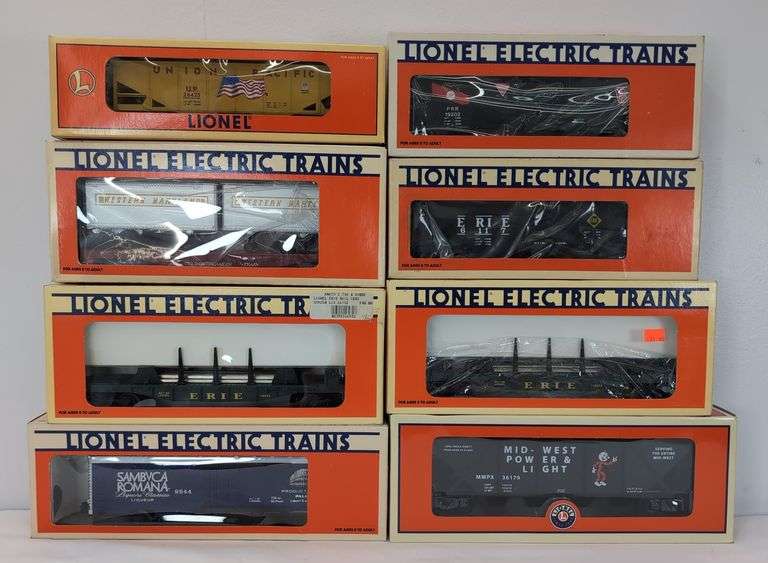 Lionel O Gauge freight; 26425 Union Pacific hopper, 19202 Pennsylvania box car, 6117 Erie operating hopper, 9844 Sambuca Romana billboard reefer, 19404 Western Maryland flat car with trailers, two 16932 Erie rail car, 36179 quad hopper, in original boxes, C7-8. 26425 box is hand identified with black marker, 6117 has a sun faded side panel, couple price stickers, etc. Boxes are generally bright, clean, square and solid.