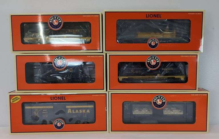 Lionel O Gauge 16474 Alaska ore car, 19682 Alaska Mint car, two 26150 Alaska three dome tank cars, 26817 Alaska box car with diesel TrainSounds and 26826 Alaska searchlight car, in original boxes, C7-8. Some boxes show a little very light wear/tears around flap corners/openings. Boxes are bright, clean, square and solid.
