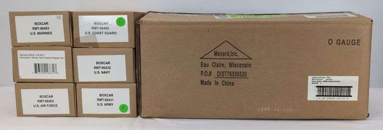 Menard's O Gauge military trains RMT-96462 USAF boxcar, RMT-96432 USN box car, RMT-96431 ARMY boxcar, RMT-96463 USMC boxcar, RMT-96446 USCG box car, 279-3569 ARMY long flat car 4-pack, 279-3871 Morton Salt covered hopper, in original boxes. Trains look C7-8, run time. Boxes show little wear, bright, clean, square and solid. Shipper for 279-3569 shows light wear, square and solid.