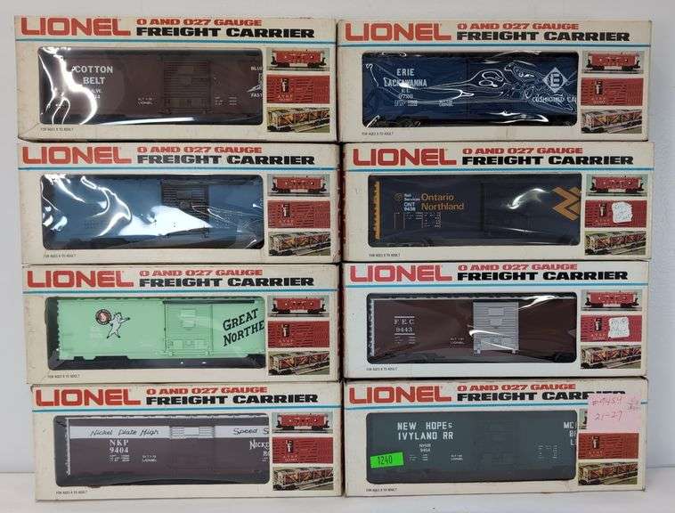 Lionel O Gauge 9401 Great Northern box car, 9404 Nickel Plate boxcar, 9768 Boston & Maine boxcar, 9414 Cotton Belt boxcar, 9454 New Hope & Ivy Land boxcar, 9443 Florida East Coast Railway boxcar, 9436 Ontario Northland boxcar, 9726 Erie Lackawanna boxcar, freight in original boxes, C7-8. Box show little to very light wear, generally bright, clean, square and solid.