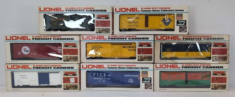 Lionel O Gauge 9789 Pickens, 9444 Louisiana Midland, 9415 Providence & Worchester, 9402 Susquehanna, 9422 Elgin, Joliet & Eastern, 9426 C&O, 9455 Milwaukee Road, 9781 Delaware and Hudson, boxcars in original boxes, C7-8. Boxes show little to light wear, some minor tears, price stickers, hand identification, etc. Boxes are bright, clean, square and solid.