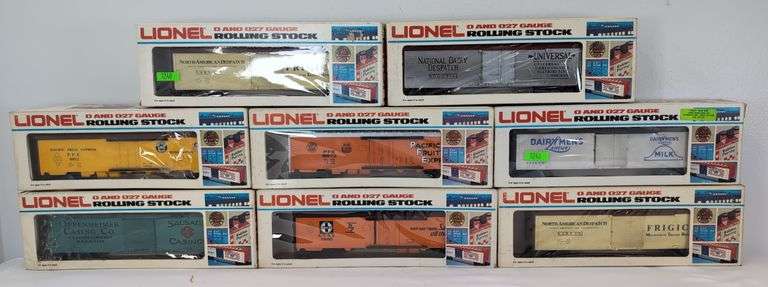Lionel O Gauge 5700 Oppenheimer, 5701 Turn of the Century Dairymen's League reefer, 5702 National Dairy Despatch, two 5703 North American Despatch, 9880 Famous American Railroad Series ATSF reefer, 9811 Famous American Railroad Union Pacific, 9872 Pacific Fruit Express, reefers in box, C7-8. Boxes show little to very light wear, some show a little age. Boxes are generally bright, clean, square and solid.