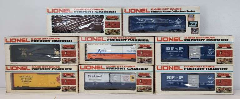 Lionel O Gauge 9412 Richmond, Fredericksburg & Potomac, 9413 Napierville Junction, 9787 Jersey Central, 9419 Famous American Railroad Union Pacific, 9733 Airco, 9412 Richmond, Fredericksburg & Potomac, 9420 B&O Sentinel, 9726 Erie Lackawanna, box cars in original boxes, C7-8. Boxes show little to very light wear, some age, hand written identification, etc. Boxes are generally bright, clean, square and solid.