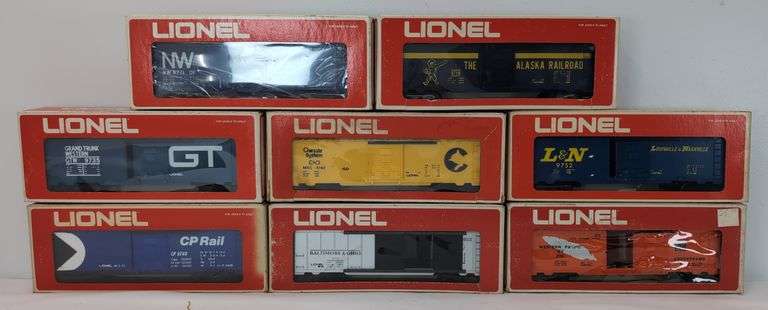Eight Lionel O Gauge boxcar in box 9748 CP Rail, 9701 B&O double door, 9771 Norfolk & Western, 9758 Alaska Railroad, 9735 Grand Trunk, 9723 Western Pacific, 9740 Chessie, 9752 Louisville and Nashville L&N, trains look C7-8. Boxes show little to very light wear, some show some age, some sun fading, generally bright, clean, square and solid with excellent display windows.