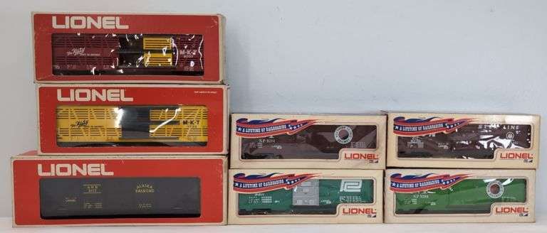 Lionel O Gauge 9707 Missouri, Kansas, Texas MKT cattle car, 9725 Missouri, Kansas, Texas MKT cattle car, 9117 Alaskan Railroad hopper, 9204 Northern Pacific boxcar, 9230 Monon boxcar, 9211 Penn Central boxcar, 9214 Northern Pacific boxcar, freight in original boxes, C7-8. Boxes show little to very light wear, hand identification, some age, etc. Boxes are generally bright, clean, square and solid.
