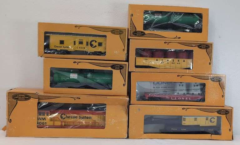 Lionel O Gauge 8061 Chessie System U36C diesel locomotive, 9328 Chessie bay window caboose, 9385 Alaska gondola, 9369 Sinclair tank, 9369 Sinclair tank, 9329 Chessie crane and 9234 Radioactive Waste car with waste containers, in original boxes. Loco looks high C7+. Freight looks C7-8. Loco box is missing flaps on one end, no styrofoam insert. Freight boxes show little to light wear and tears, square and solid.