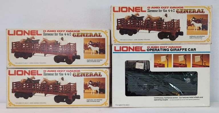 Lionel O Gauge 7913 Turtle Back Zoo Giraffe car and three 9553 W&ARR horse cars in original boxes, C7-8. One 9553 is unassembled with correct original horses, one has a "hog" load, other has a "cattle" load. Boxes show little wear, two have custom sticker labels, generally bright, clean, square and solid.