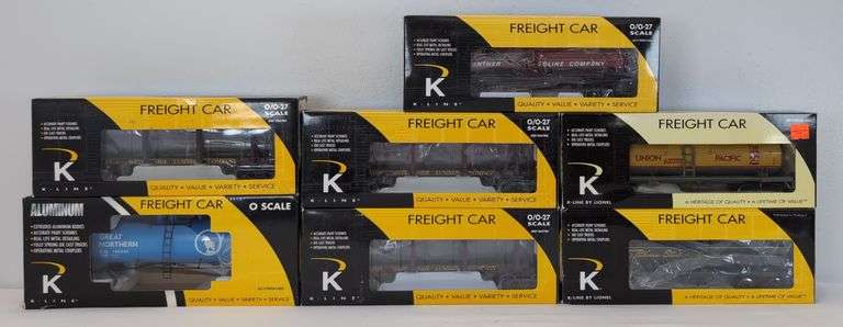 K-Line O Gauge K663-80271 BST 6-1587 Western Depot Exclusive West Side Lumber car 17427, K663-80272 BST 6-1588 Western Depot Exclusive West Side Lumber car 17524, K663-80273 BST 6-1589 Western Depot Exclusive West Side Lumber car 17555, K635-8014 Panther Gasoline Company double dome tank car, K-90016 Great Northern extruded aluminum tank, 6-21440 Union Pacific tank and 6-21717 Pullman-Standard CMC single dome tank, in original boxes, C7-8. Boxes show little to very light wear, some price stickers, etc. Boxes are bright, clean, square and solid.