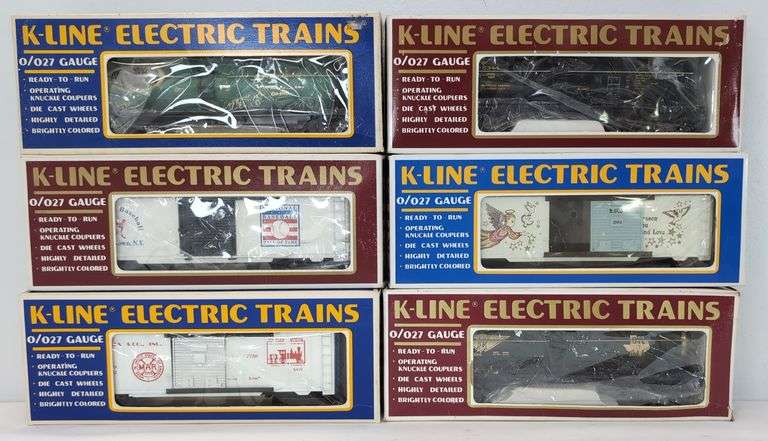 K-Line O Gauge TCA Museum TTM7788 Marx 6419 box car, K6453 National Baseball boxcar, K-6312 Great Western Wine tank, K6389 Ewing Oil tank, K647403 1994 K-Line Christmas car, K6344 Erie tank, in original boxes C7-8. Boxes show little to very light wear, some price stickers, etc. Boxes are generally bright, clean, square and solid.
