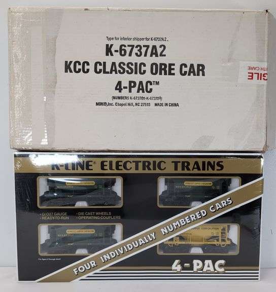 K-Line O Gauge K-6737A2 KCC Classic Ore Car 4-Pac Mint factory sealed in open shipper, C10. Kennecott Copper Corporation KCCX 673705, KCCX 673706, KCCX 673707, KCCX 673708. Box has un-torn factory over-wrap material. Shipper shows little wear, square and solid.