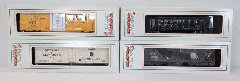 Crown Model Decorators O Gauge freight cars; AC&Y 50-ton 2-bay hopper, D&M reefer car #2002, AC&Y box car, W&LE 3-bay offset hopper, in original boxes C7-8. Boxes show no wear, bright, clean, square and solid.