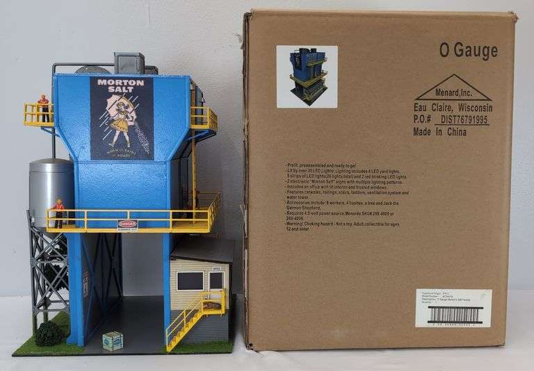 Menards O Gauge Morton Salt Factory 279-3487 in original box, displayed C7. Box shows little wear, square and solid.