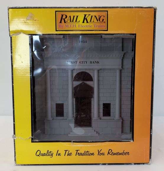 MTH Rail King 30-9017 First City Bank 2-tone gray with red windows in original box, displayed C8. Box has some tears around the display window and some very light wear, bright, clean, square and solid.