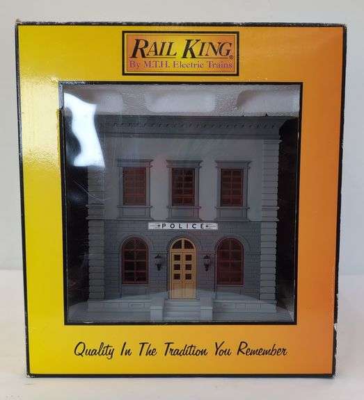 MTH Rail King O Gauge 30-9099 Police Station 2-Tone gray with maroon window in original box, displayed C8. Box shows little wear, bright, clean, square and solid.