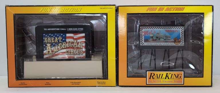 MTH Rail King O Gauge 30-90060 Mel's Diner lighted billboard & 30-9131 operating Circus billboard, in original boxes, displayed C7-8. Boxes show little wear, bright, clean, square and solid.