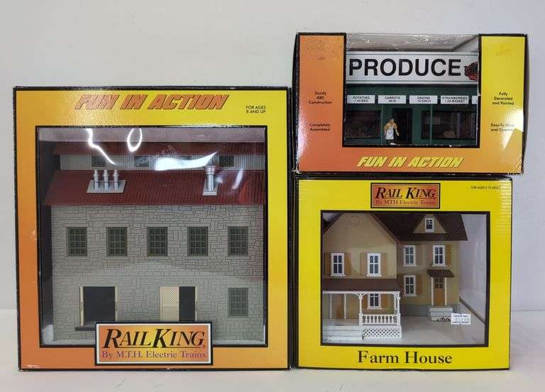 MTH Rail King O Gauge 30-90188 Granary gray stone with red oxide roof, 30-90178 Vegetable Stand road side stand, 30-9088 Farm House cream with yellow shutters, layout buildings in original boxes, displayed C7-8. Boxes show little wear, bright, clean, square and solid.