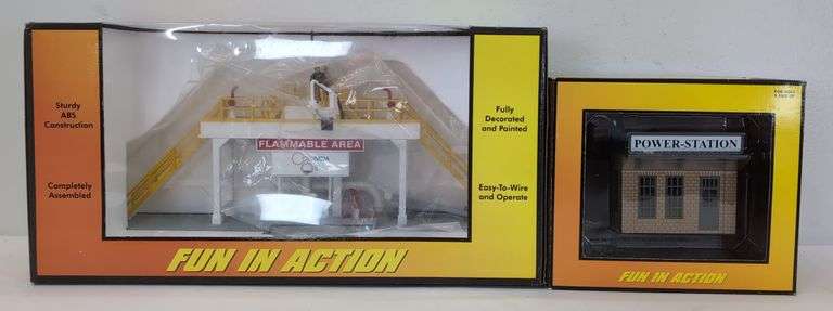 MTH Rail King O Gauge 30-90003 Power Station cream and dark gray & 30-9117 Columbia Oil operating storage tank, layout accessories in original boxes. Displayed C8. Boxes show little to very light wear, bright, clean, square and solid.
