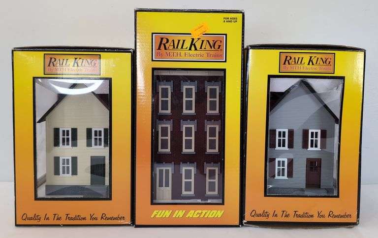 MTH Rail King O Gauge 30-9023 row house, yellow with green shutters; 30-9024 row house, gray with red shutters; 30-9080 3-story house, maroon with tan trim; layout buildings in original boxes, displayed C8. Boxes show little to very light wear, bright, clean, square and solid.