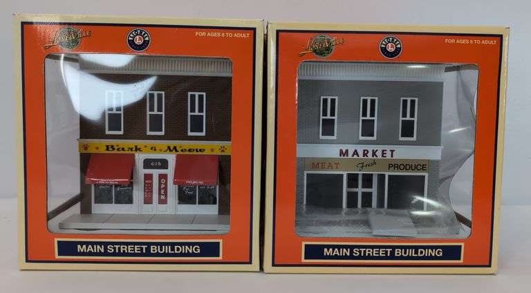 Lionel O Gauge 34125 Bark and Meow custom designed by Grzyboski's Trains & 34126 Market, layout accessory buildings in original boxes, displayed C8. Boxes show little to very light wear, bright, clean, square and solid.