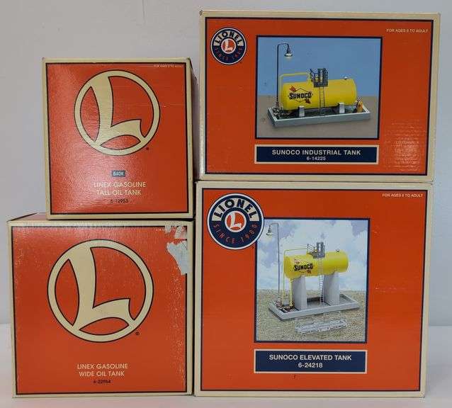 Lionel O Gauge 12953 Linex Gasoline tall oil tank, 22954 Linex Gasoline wide oil tank, 14225 Sunoco industrial tank and 24218 Sunoco elevated tank, layout accessories in original boxes, displayed C7-8. Boxes show little to very light wear, bright, clean, square and solid.