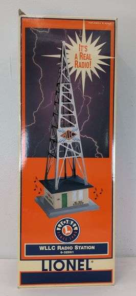Lionel O Gauge 32991 WLLC Radio Station in original box, displayed C8. Box shows some light wear, bright, clean, square and solid.
