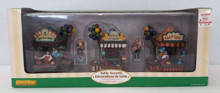 Lemax Village Collection 43440 Carnival Kiosks in original box with figures, displayed C8. Box shows little wear, bright, clean, square and solid.