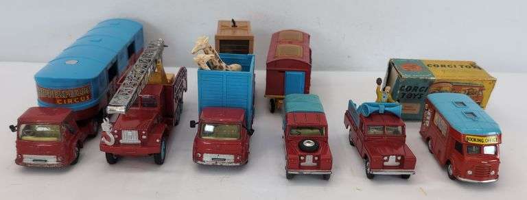 Corgi Toys Chipperfield Circus vehicles; Bedford Tractor unit and Articulated Horse box, International 6x6, Bedford Tractor unit, Circus Animal Cage, Land Rover, Platform Trailer, Land Rover with speakers and announcer, 426 Chipperfields Circus Mobile Booking Office, in partial box. Vehicles have minor chips, very few scratches, really nice looking, very clean vehicles with no missing tires. Two giraffes and one elephant.