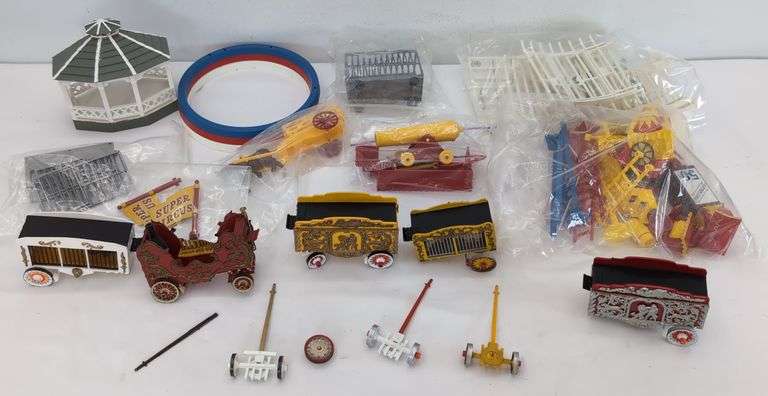 Circus wagons, rings, lion act cage, calliope, popcorn and more circus/carnival related items, displayed C7-8. Nothing is marked other than one item is marked Made in China. Some wagons have detached front axle sets, none appear damaged. Neat lot of accessory items for a Circus or carnival diorama on your operating layout. View the photos carefully for the best description.